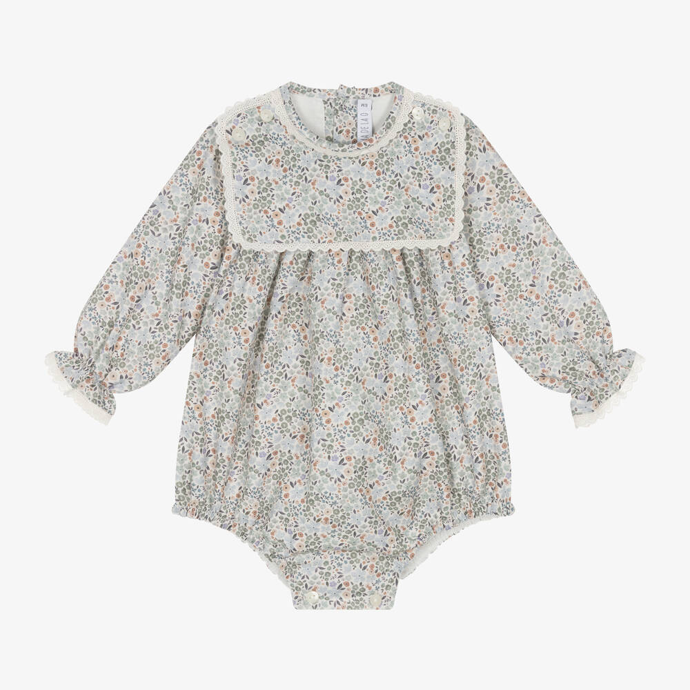 A traditionally styled, long-sleeved shortie for baby girls by Spanish brand Paloma de la O. Made in soft cotton twill, the ivory background is patterned in a pretty floral print in blue, green and beige. The frilly cuffs and classic bib front are edged in scalloped lace, with decorative buttons at the shoulders. Lined in lightweight voile for comfort, this charming babysuit fastens with buttons on the back and between the elasticated legs.