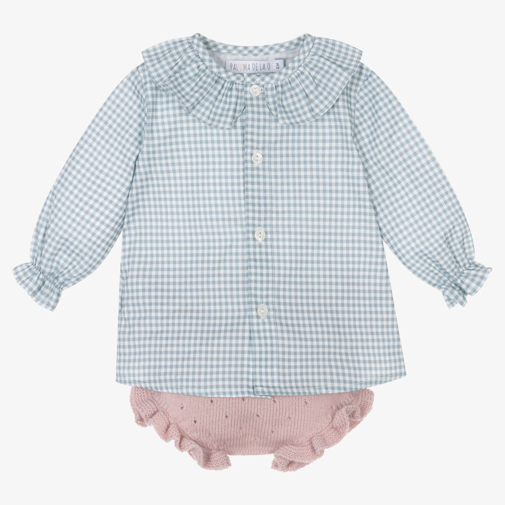 A classic shorts set for baby girls by Paloma de la O, including a blue check blouse and pink shorts. Made from soft cotton twill, the long-sleeved blouse has a sweet ruffled collar, dainty elasticated cuffs, and pearlescent button fastenings on the front. The pointelle knit shorts have pretty frilled trims and a stretchy, ribbed waist for a comfortable fit.