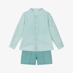 A lovely beige sweater, white blouse and shorts set for baby girls by Paloma de la O. The lightweight cotton blouse has a pretty pink and grey floral print and a ruffled neckline, with button fastenings on the back. The coordinating bloomer shorts have an elasticated waist and cuffs, and a sweet ruffle trim. A cosy knitted sweater completes the set with a bow on the front.