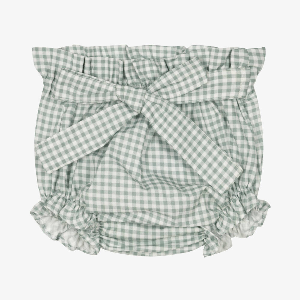 Cute white and green checked bloomer shorts for baby girls by Paloma de la O, made in lightweight cotton. They have an eye-catching bow on the front for a sweet finish and the elasticated trims ensure they are as comfortable as they are cute.