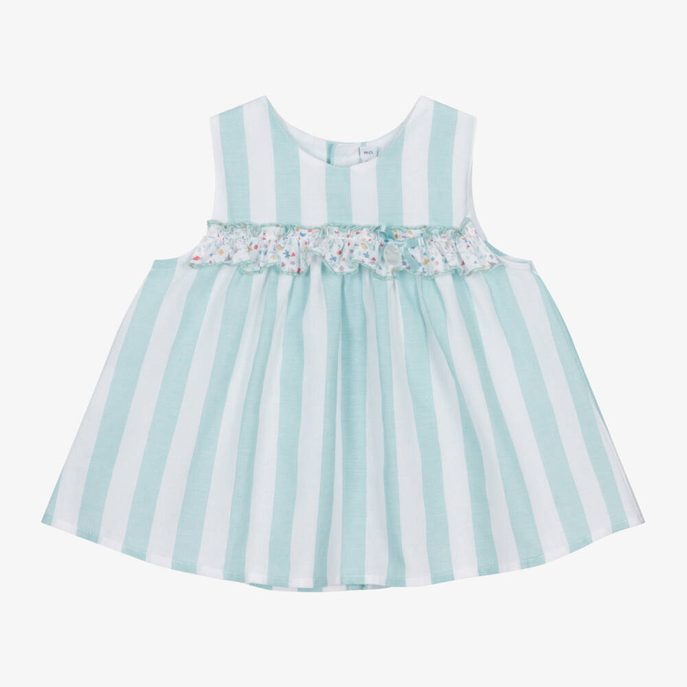 Striped in shades of mint green and white, this sleeveless dress for baby girls is by Spanish brand Paloma de la O. Woven in a light cotton blend, this sweet design has a ruffled panel across the waistline with pretty purple, yellow and blue flowers. Attached is a little satin bow and a round logo charm. The dress has a round neckline, a lined bodice and glossy white buttons on the back. Matching knickers are elasticated on the waist and around the legs for a comfortable fit.