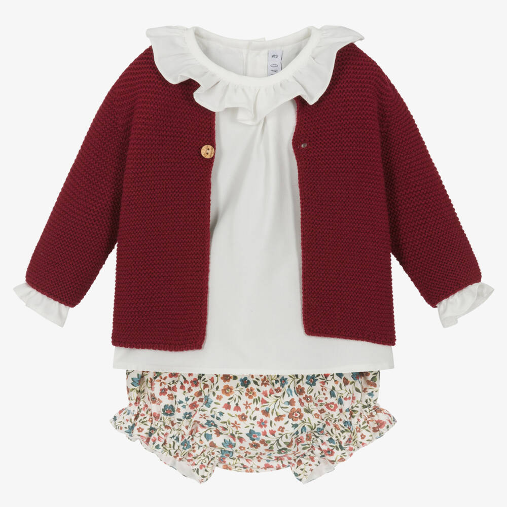 Delightful ivory and red floral shorts set for baby girls by Paloma de la O. The ivory cotton blouse has a lovely ruffle collar, elasticated cuffs and button fastenings on the back. The fully lined, bloomer style shorts have a comfortable elasticated waist and cuffs, with sweet ruffle trims. A warm and cosy, button-fastening knitted cardigan in a lovely shade of burgundy red, completes the set.