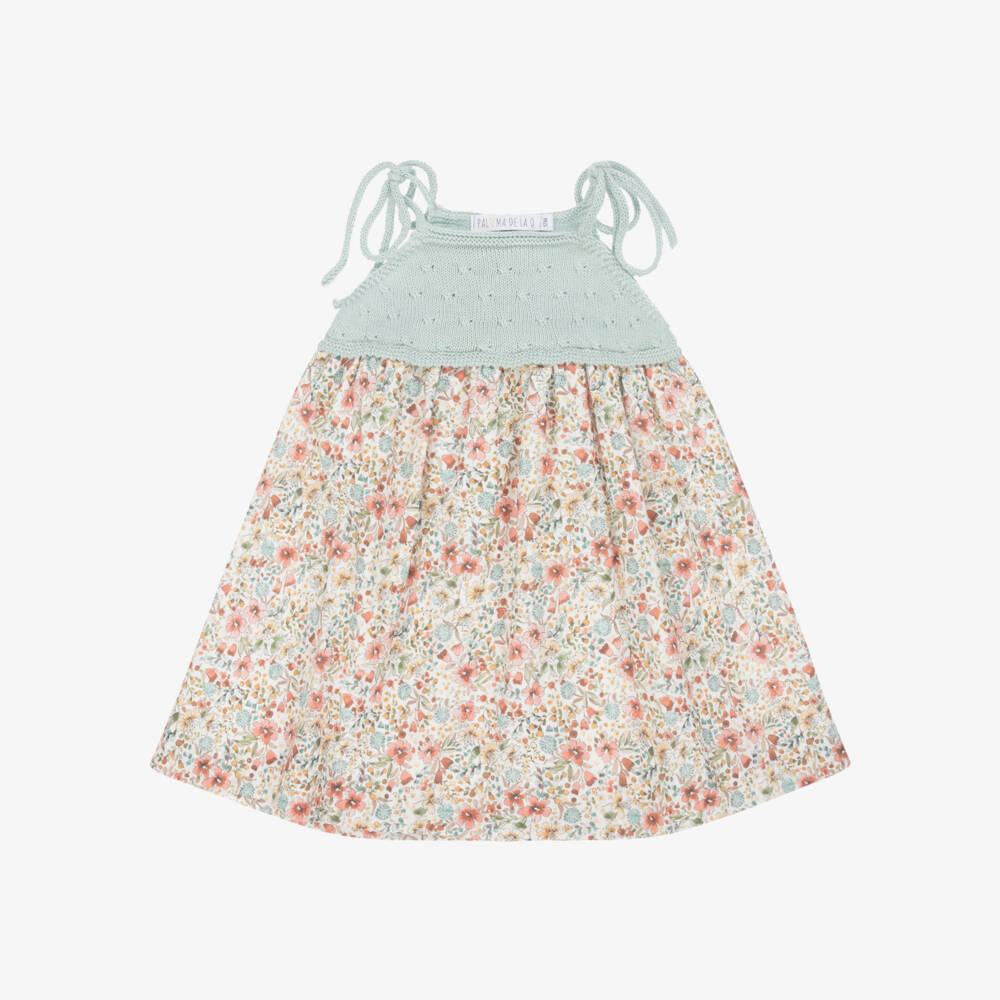 Exclusive to Childrensalon, mint green and pink dress by Paloma de la O featuring a charming knitted bodice paired with a delicate floral skirt for baby girls. Crafted from soft cotton, this dress offers comfort and style for warm days with adjustable straps.