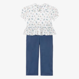 In a lovely shade of dusty pink, this trouser set for baby girls is by Paloma de la O. The blouse is made from soft cotton, with a charming ruffle collar and sleeves, and button fastenings on the back. The cardigan and matching trousers are beautifully knitted with a textured pattern. The cardigan fastens with buttons and the trousers have a comfortable elasticated waistband.