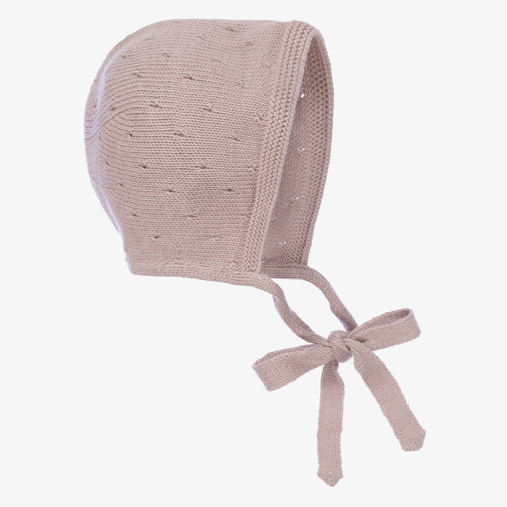 Lovely dusky purple bonnet for baby girls, designed by Paloma de la O. Knitted in a soft cotton blend, it has sweet pointelle detailing and garter stitch details around the trim for a charming finish. It ties easily underneath the chin for a secure fit.