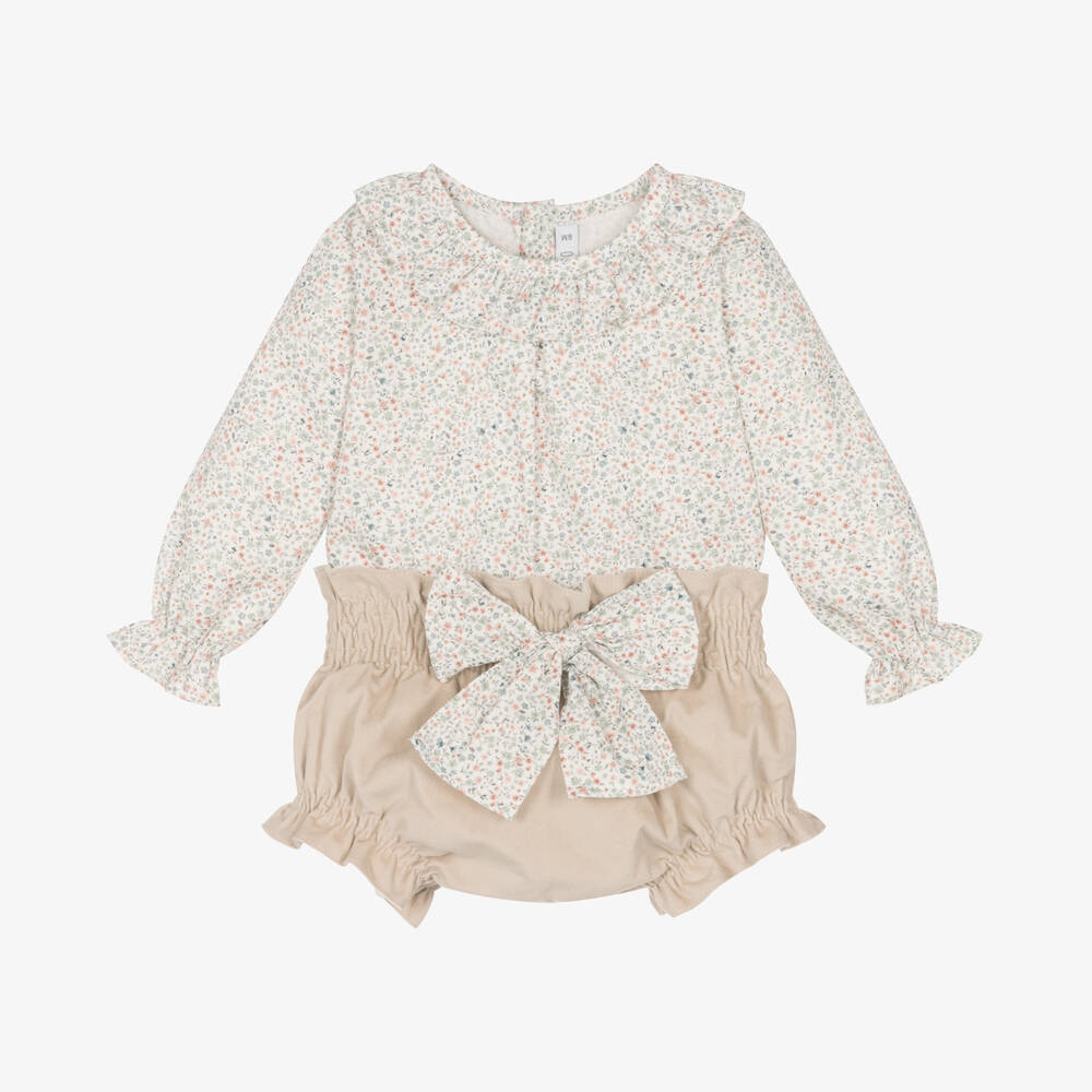 Exclusive to Childrensalon, this cotton shorts set for baby girls is by Spanish brand Paloma de la O. The white blouse is patterned with sweet ditsy florals in muted shades of pink, blue and green. It has a frilly collar, elasticated cuffs and pearly buttons on the back for added detail. As part of the outfit, the beige velvet shorts have a shirred waistband, partly concealed by a matching floral bow on the front. They have a gentle cotton voile lining and elasticated leg openings for comfortable wear.