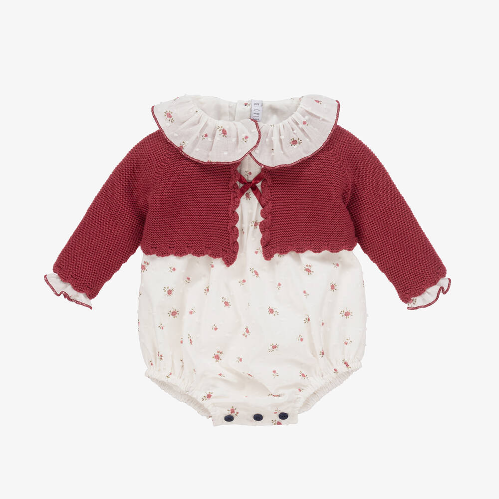 In white and raspberry red, this traditionally styled shortie and cardigan set for baby girls is by Spanish brand Paloma de la O. Made in lightweight plumeti cotton, the shortie is patterned in a pretty floral print and decorated with a satin ribbon bow on the front. It has a sweet ruffle collar, long sleeves with frilly cuffs, and fastens with buttons on the back and between the legs. The softly knitted bolero-style cardigan has scalloped edges for a classic finish, and fastens with a single button at the neck.
