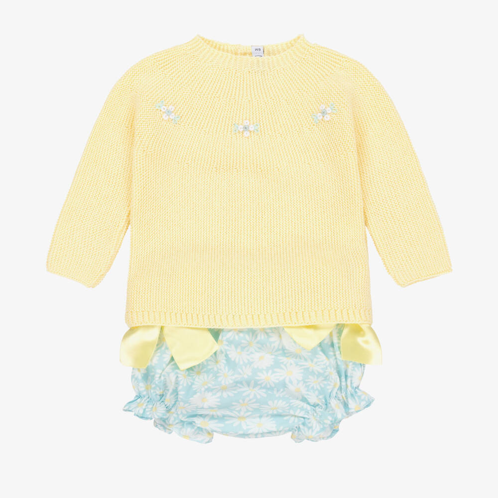 Yellow and blue shorts set for baby girls by Paloma de la O. The yellow top is knitted in a soft cotton blend and has pretty blue and yellow floral embroidery on the front. There are useful button fastenings on the back. The sweet light blue bloomer shorts have a yellow and white daisy pattern and lovely yellow satin ribbon bows on the sides. Cool and lightweight they have a comfortable elasticated waistband and cuffs.
