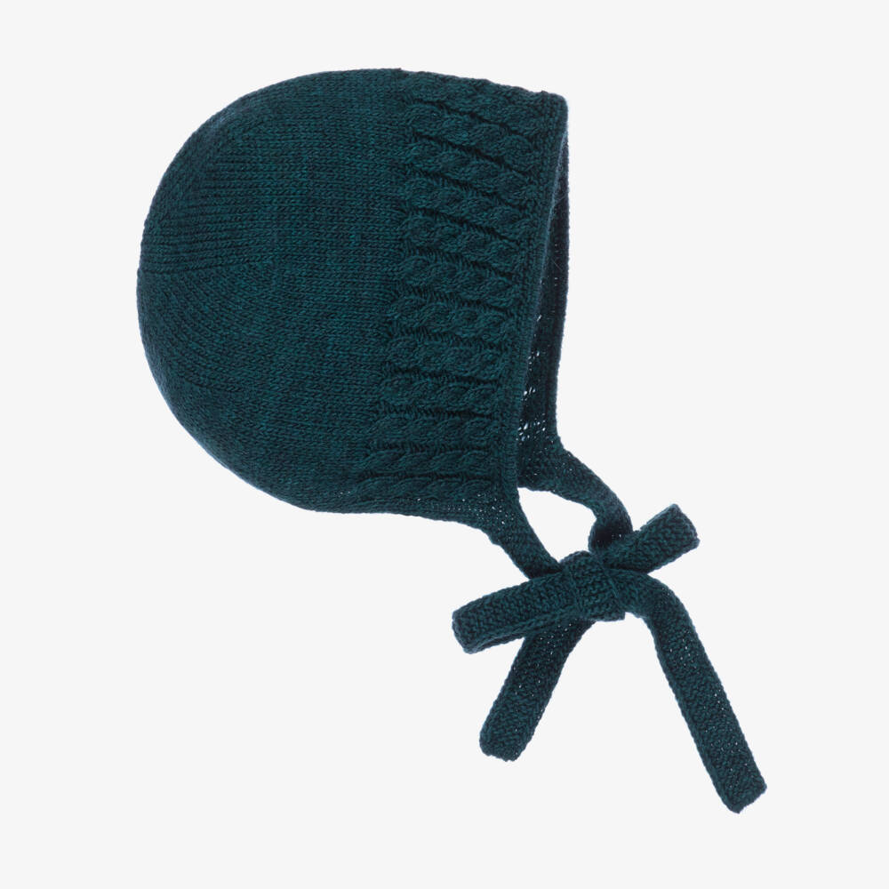 Lovely petrol-blue bonnet for little boys and girls by Paloma de la O. Knitted, it has a charming cable knit pattern around the brim. Soft and comfortable, is secured with knitted ties under the chin.