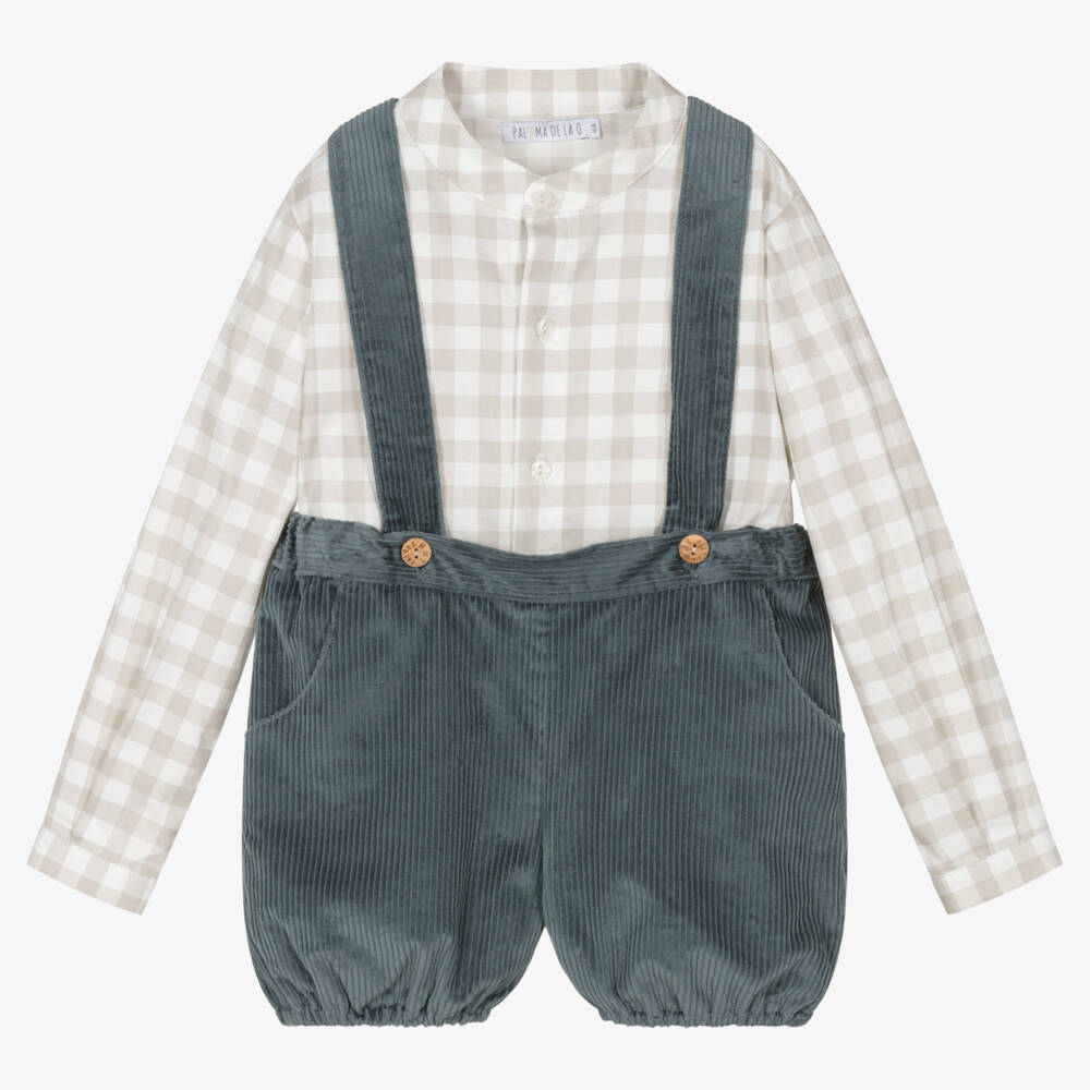 Traditionally styled petrol blue shorts set for younger boys by Paloma de la O. The comfortable shorts are made in a soft cotton corduroy and have branded button fastening shoulder straps, that are elasticated at the back for comfort. The cuffs and waistband are gently elasticated and they have useful pockets on the front. The collarless shirt is made in a soft cotton poplin and patterned in a smart beige gingham check, with button fastenings on the front and cuffs.