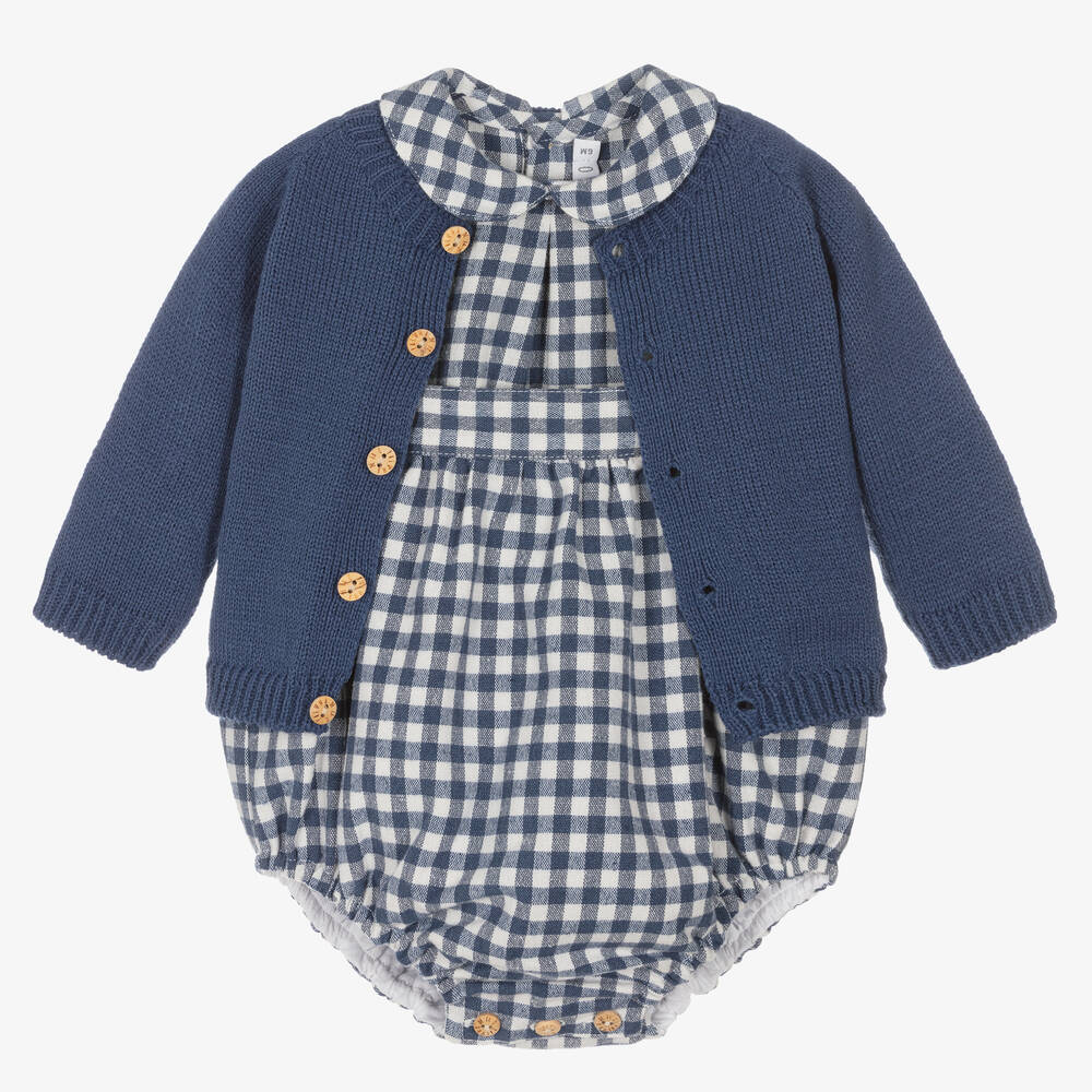 A classically styled outfit for baby boys from Paloma de la O, in white and deep marine blue. Softly knitted, the cardigan has grey panels on the elbows designed to look like traditional patches, ribbed trims, and wooden front button fastenings. Made in a soft, brushed cotton blend, the checked shirt has a Peter pan collar and back button closures, and the matching shortie has buttons on the shoulder straps and between the legs. The shortie is designed with an elasticated back panel and soft cotton lining for comfort.