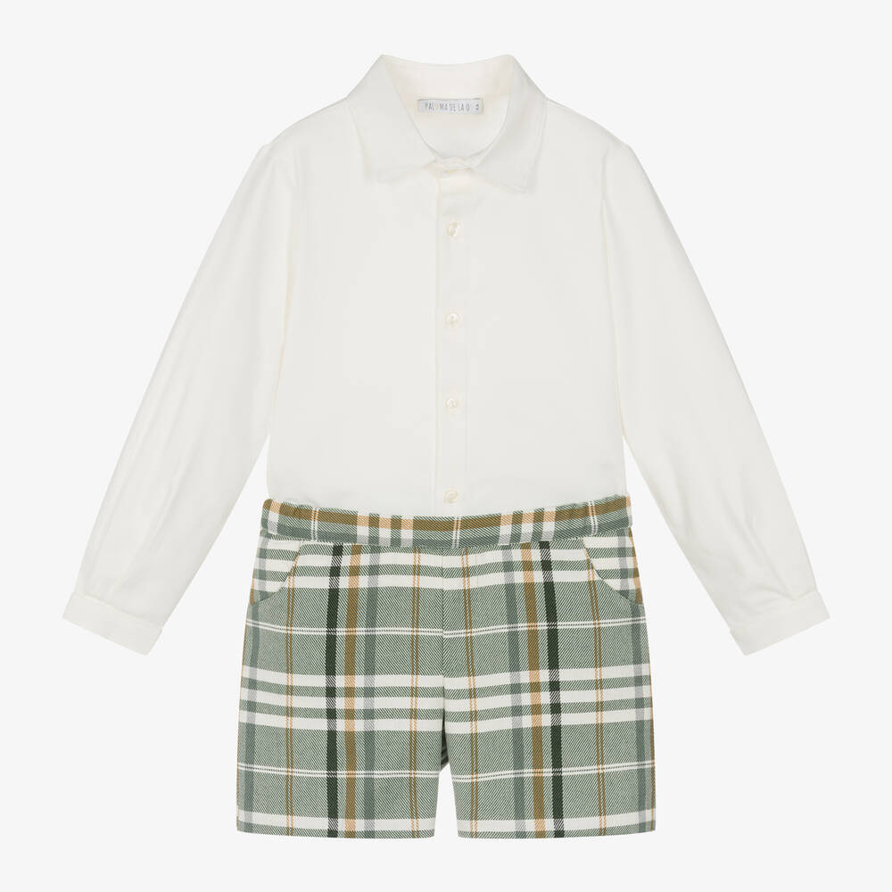 In ivory and green, this smart-casual shorts set for boys is by Spanish brand Paloma de la O. Woven in soft cotton twill, the long-sleeved shirt has a pointed collar and button fastenings down the front. Also in twill fabric, the cotton-blend checked shorts are lined in lightweight voile, with a party elasticated, adjustable waist for a comfortable fit. They have useful pockets at the front to finish.