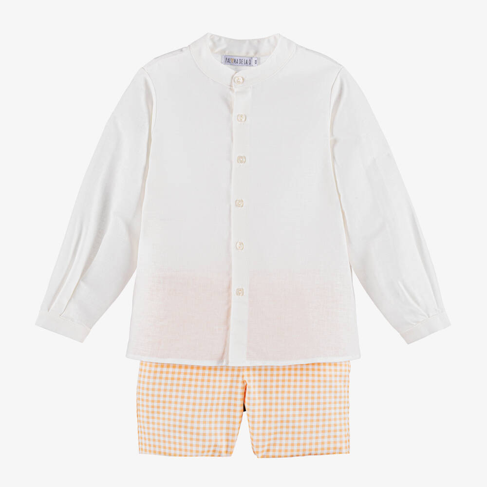 Exclusive to Childrensalon, an ivory shirt and pastel orange checked shorts set from Paloma de la O, ideal for smart casual wear. The lightweight collarless shirt is made in a cotton and linen blend with long sleeves and button fastenings on the front and cuffs. The checked, pull-on shorts are made in lightweight cotton and fully lined for comfort. They are styled with front pockets and a partially elasticated waistband that is adjustable for an ideal fit.