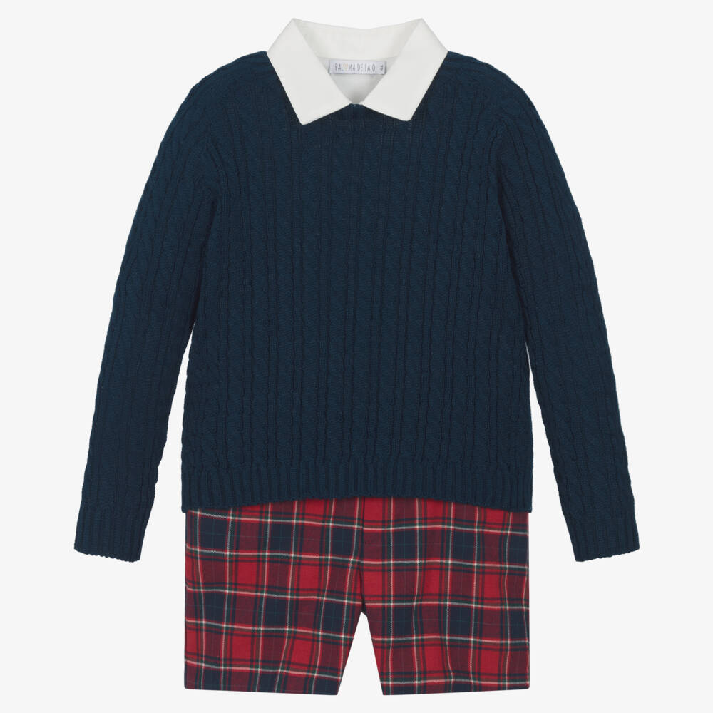 This navy blue, red and ivory outfit for boys from Paloma de la O is styled with traditional elements for a smart look. The shirt is made in soft cotton twill, with a classic pointed collar and button fastenings on the front. Made in a soft, brushed wool blend, the cosy tartan shorts have front pockets, a comfortable cotton lining, and a part-elasticated, adjustable waist for the ideal fit. Completing the set is the sweater, designed with a charming cable-knit pattern.