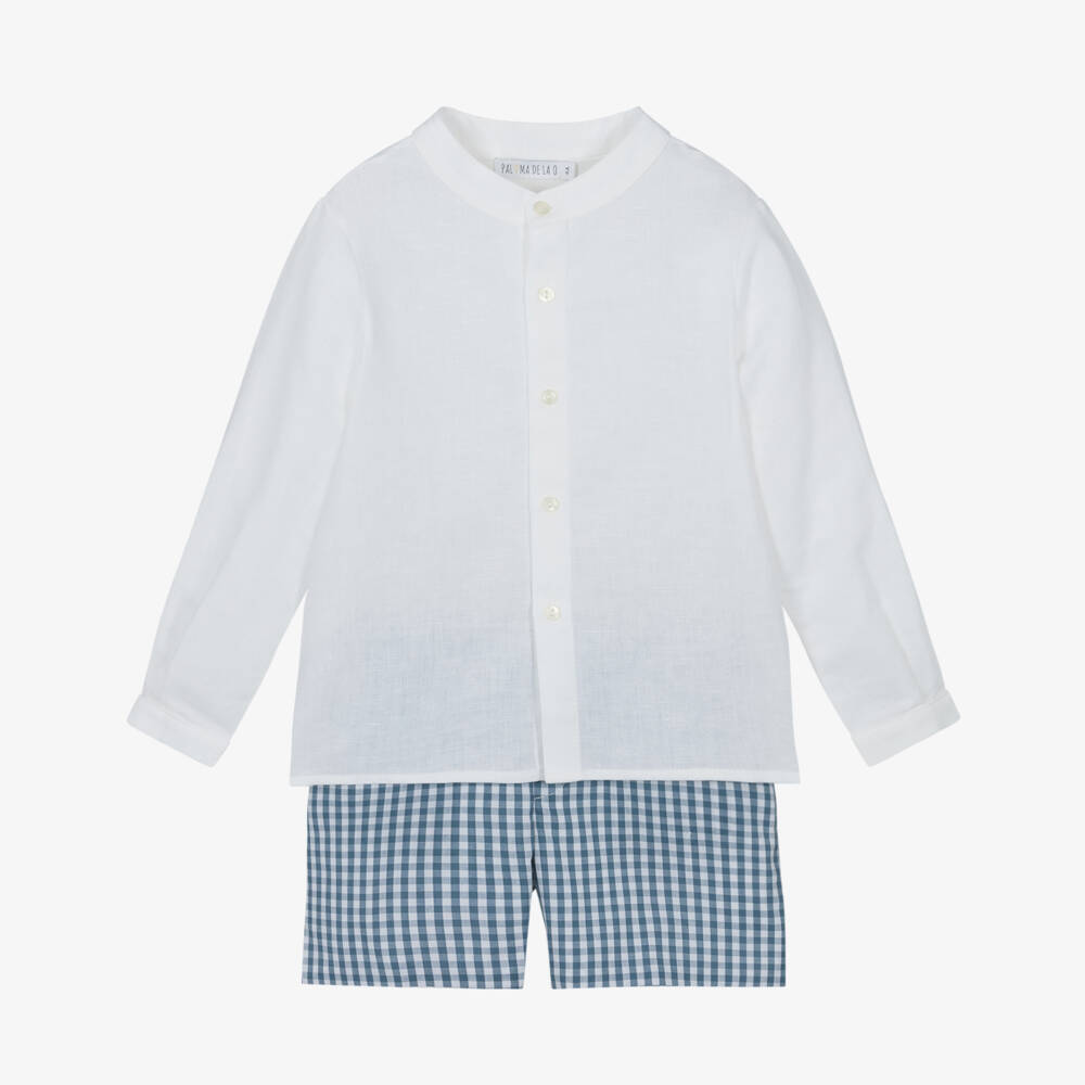 Exclusive to Childrensalon, this white and blue shorts set for boys is by Paloma de la O. The collarless shirt is in a breathable cotton and linen blend, ideal for warmer weather. The gingham check shorts are in lightweight cotton and fully lined, with an elasticated adjustable waist and front pockets. Ideal for smart-casual wear, the outfit combines elegance with all day comfort.
