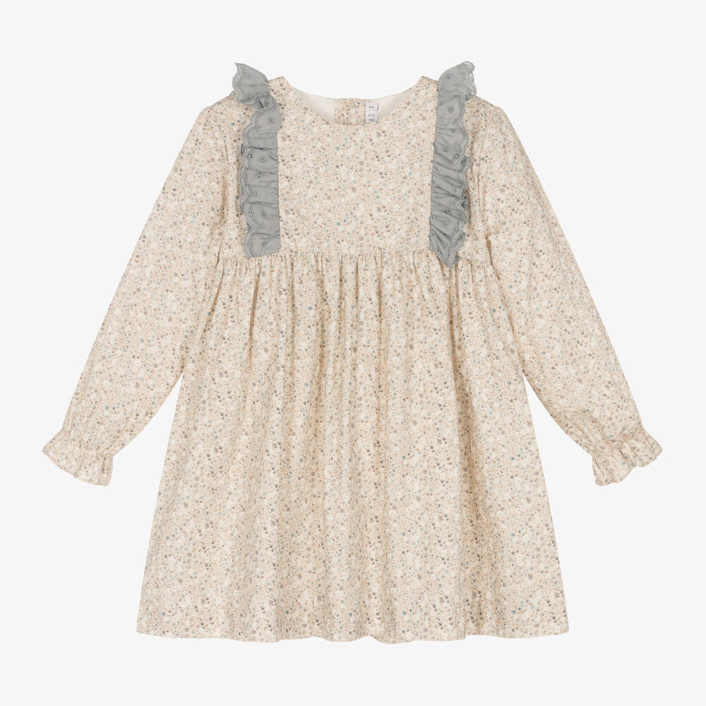 Girls Beige Floral Print Cotton Dress