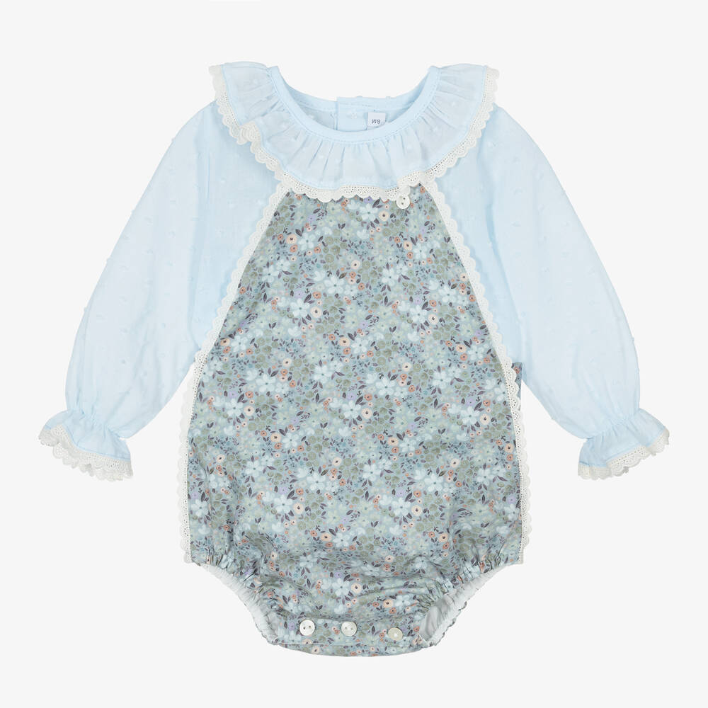 A cute, blue cotton babysuit set for girls by Paloma de la O. The lightweight plumeti blouse features a charming ruffled collar and elasticated ruffle cuffs, with button fastenings on the back. It pairs with a gorgeous, floral-patterned twill shortie in shades of blue and green. Elasticated on the waist and cuffs, the shortie has a lightweight lining and fastens with buttons on the shoulder straps and between the legs. For a lovely finishing touch, both pieces have pretty ivory lace trim.