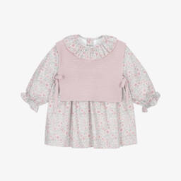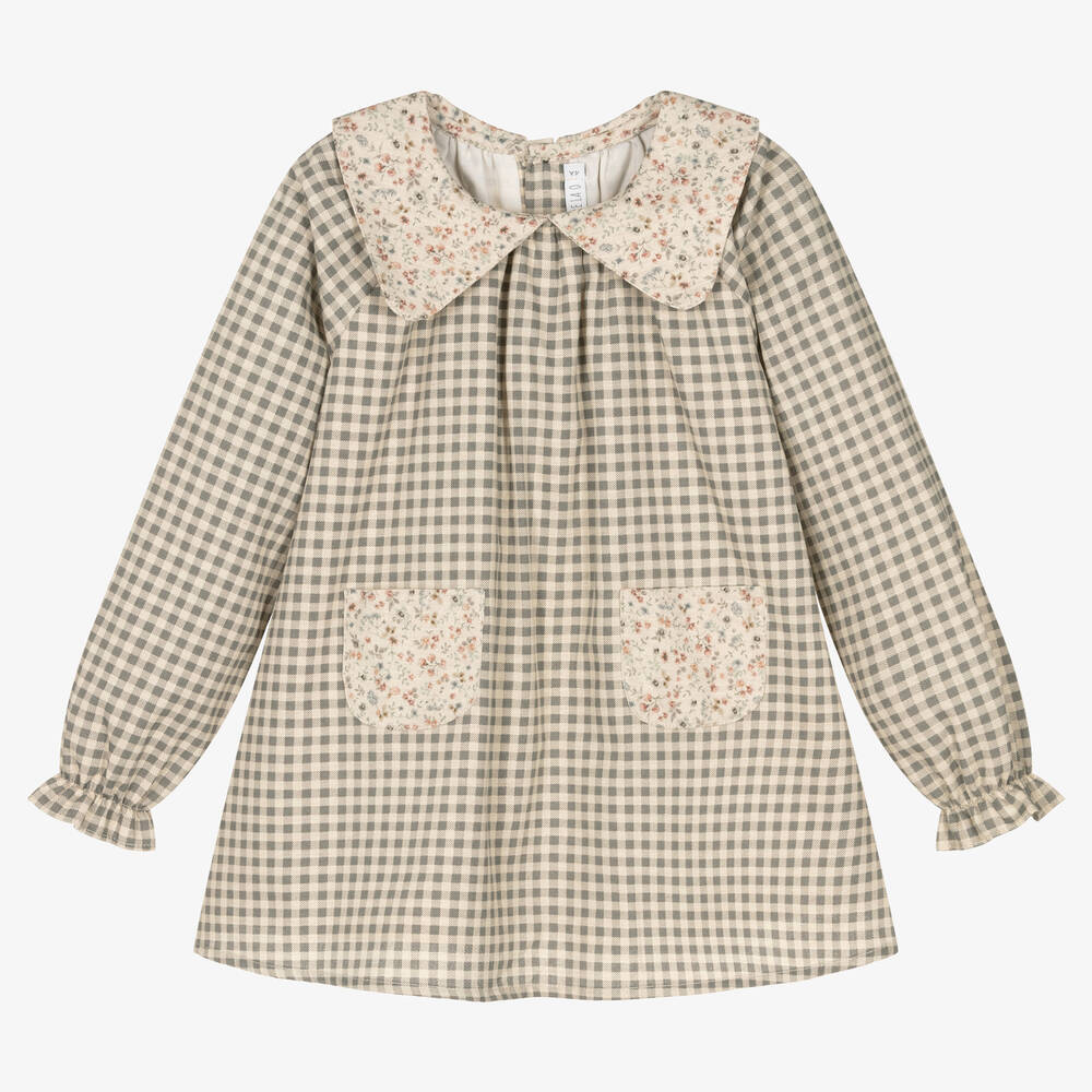 Little girls grey and beige check dress with knickers from Spanish brand Paloma de la O. Both the dress and knickers are made and lined in soft woven cotton for all-day comfort. The dress has pointed collar and front pockets patterned with delicate vintage floral prints in pale pink and blue. It fastens easily with buttons on the back for a classic look. The matching floral print knickers have an elasticated waist, gentle on little tummies.