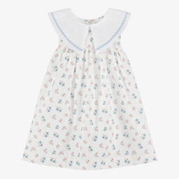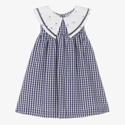 This navy blue and white gingham dress by Paloma de la O is a charming choice for girls. Woven in smooth cotton poplin, it features a contrasting nautical-themed collar, with a delicate sailboat print and ric rac trim. Lined in lightweight voile for comfort, it fastens neatly with buttons on the back.