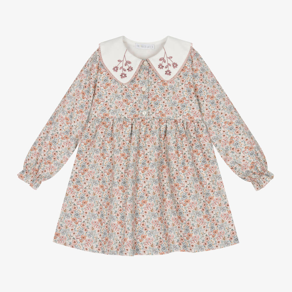 Exclusive to Childrensalon, a dusky pink dress for girls by Spanish brand Paloma de la O. It is made in soft cotton twill and patterned in a pretty floral print in pink and blue. It has a contrasting white collar, trimmed in delicate lace and decorated with beautiful floral embroidery. Lined in lightweight voile for comfort, this traditional style has frilly cuffs on the long sleeves and fastens with pearlescent buttons on the front.
