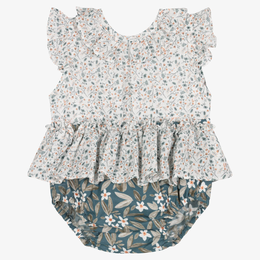 Cute white and petrol blue floral shorts set for little girls by Paloma de la O, made in lightweight cotton. Patterned in a ditsy print, the blouse has pretty ruffles on the collar and shoulders. There is an inverted pleat on the front for a relaxed shape and an open back with tie fastenings. The elasticated shorts have a matching floral ruffle and a lovely contrasting pattern.