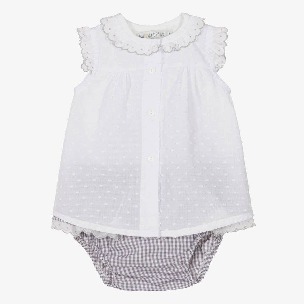 A lovely white and grey shorts set for little girls by Paloma de la O, made in a soft and lightweight cotton weave. The cotton plumeti blouse is designed with textured dots and tonal front button fastenings. It has a pretty scalloped collar with an embroidered grey edge, and coordinating trims on the sleeves. The grey gingham shorts have a sweet layered ruffle and an embroidered trim to match the blouse.