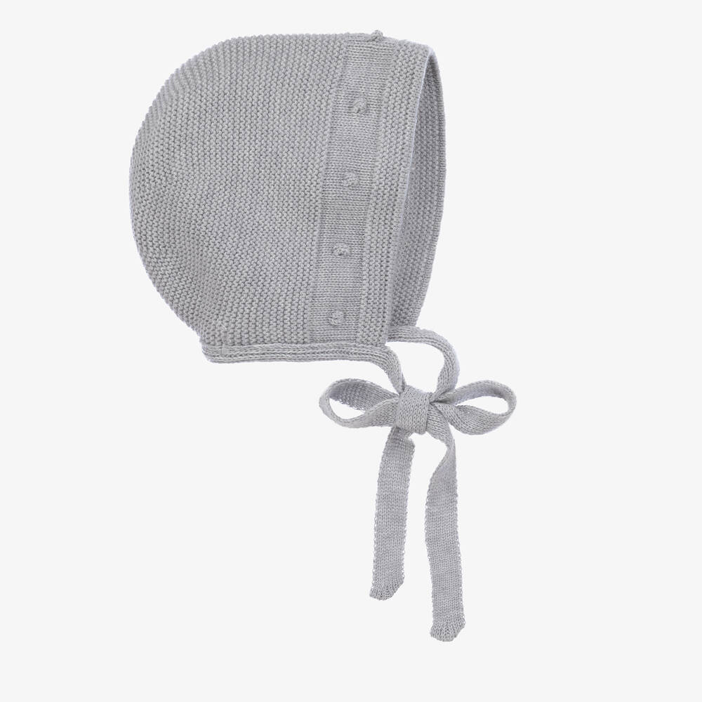 A lovely grey bonnet for baby boys and girls by Spanish brand Paloma de la O. It is knitted in a soft wool blend, with sweet bobble detailing around the brim. Cosy and comfortable, it secures with under the chin.