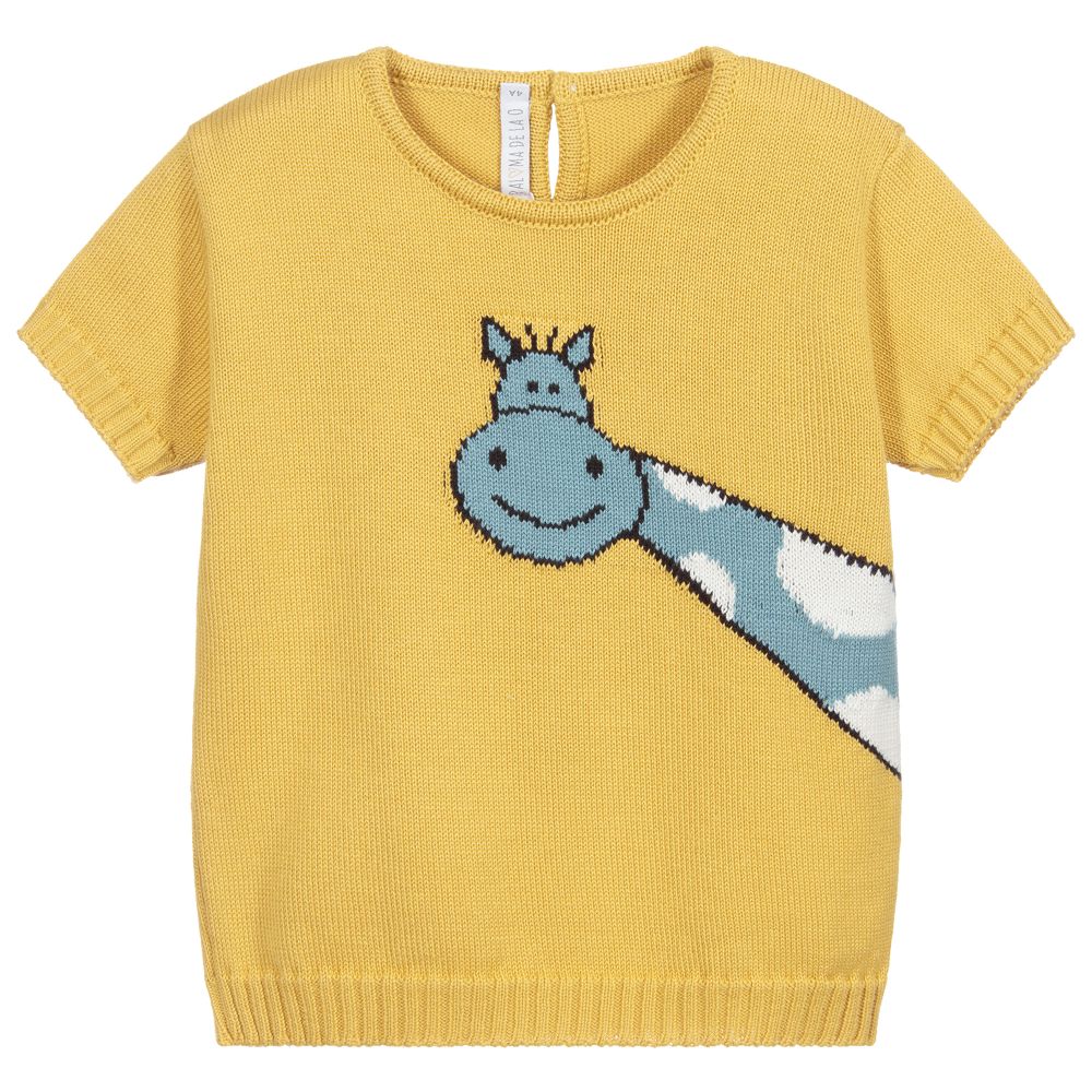 Younger boys mustard yellow sweater by Paloma de la O, with a cute green and ivory giraffe motif. Knitted from a soft cotton and acrylic blend, this short sleeved sweater has lightly ribbed edges and back button fastenings.
