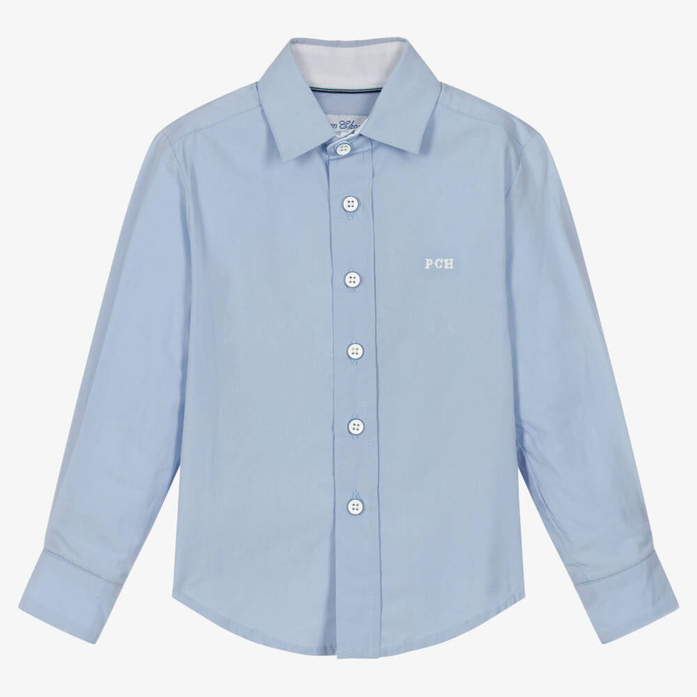 Classic blue shirt for boys by Pan Con Chocolate, woven in smooth poplin. It has stylish white button fastenings and white trim on the inside cuffs, with a curved hemline for wearing either tucked or untucked. The white logo embroidery on the chest adds a finishing designer touch.