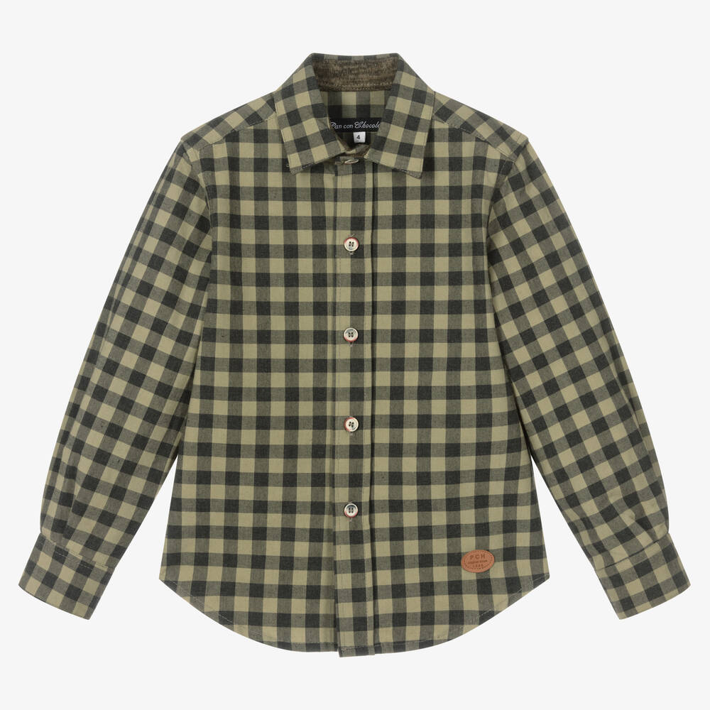 Casual green gingham shirt for boys by Pan Con Chocolate, made in soft, mid-weight, easy-care polyester. Fastening with white, red and black buttons on the front and cuffs, it has a brown logo patch above the hemline. The cuffs are lined in grey marl jersey, which can be seen when folded back.