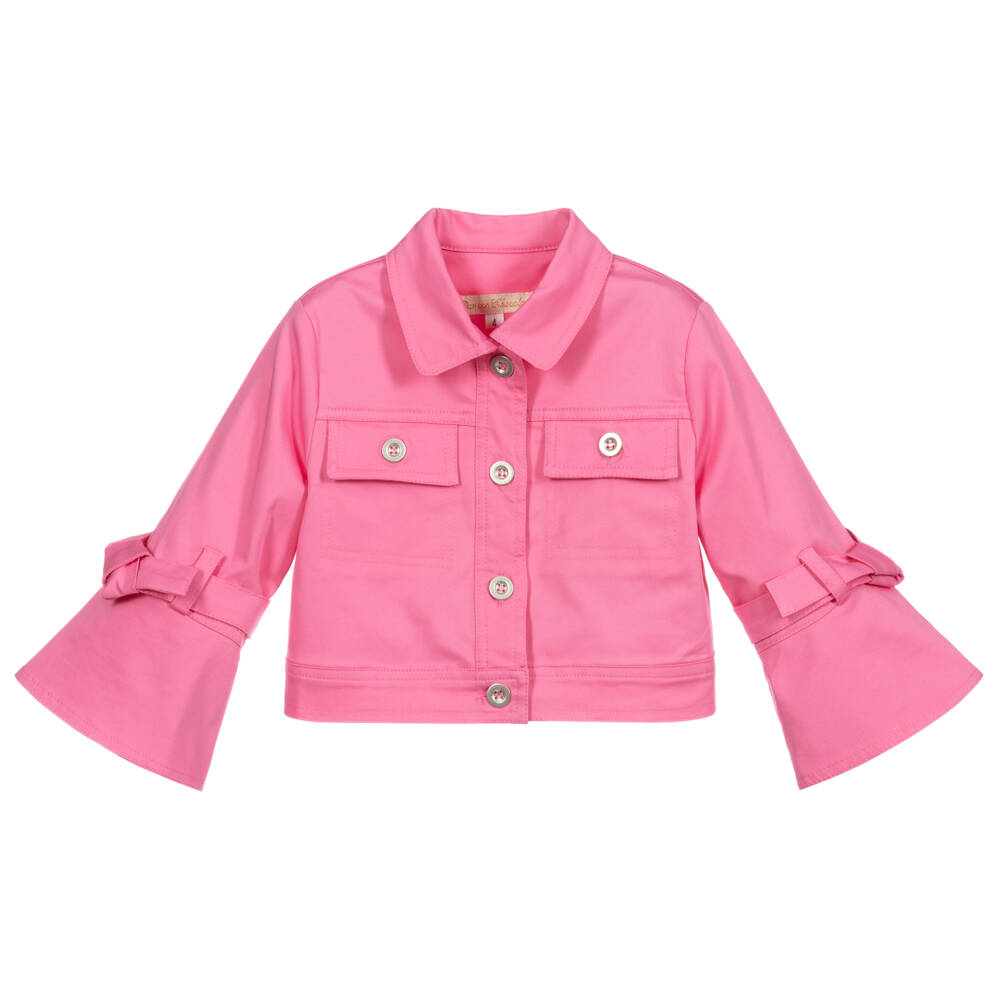 Stylish pink jacket for girls by Pan Con Chocolate, made in soft cotton with a slight stretch. It has two chest pockets, silver button fastenings and flared sleeve cuffs with fabric ties.