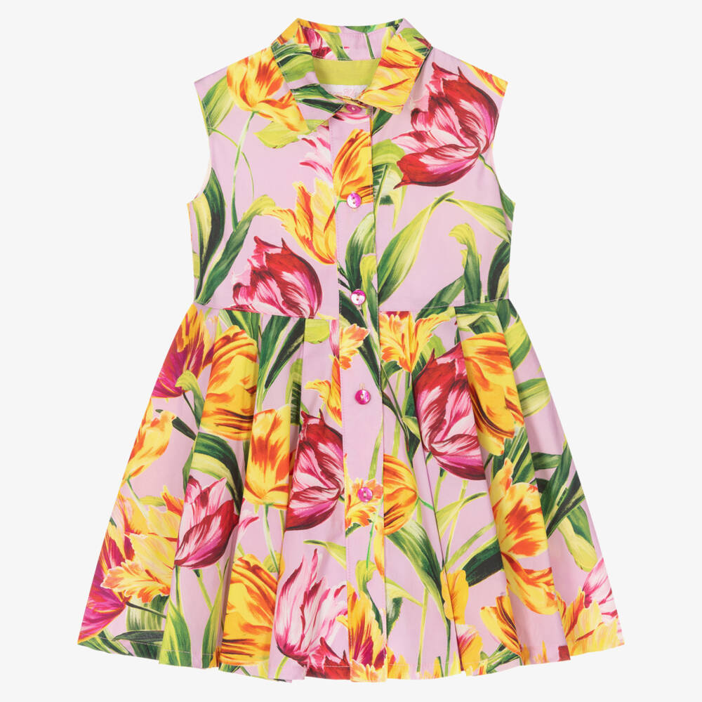 Pretty cotton shirt dress for girls by Spanish brand Pan Con Chocolate, with a beautiful tulip print in pink, green and yellow. Made in lightweight cotton poplin, this classic style has a pointed collar and a pleated skirt. Branded button fastenings on the front add a discreet designer touch.