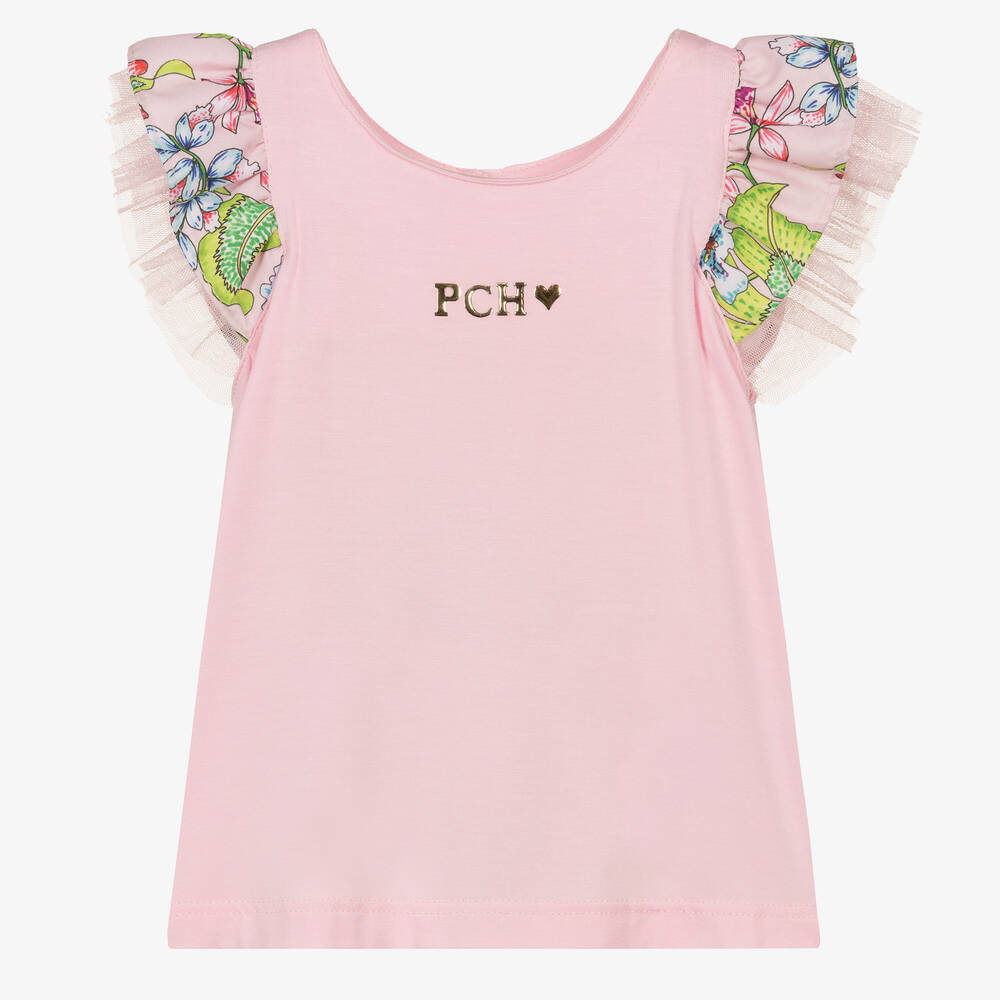 Pretty pink top for girls by Pan Con Chocolate, made in soft and stretchy jersey. It has pretty ruffle trim on the shoulders in floral cotton and soft tulle. There is a shiny gold logo on the front and a stylish keyhole fastening on the back.