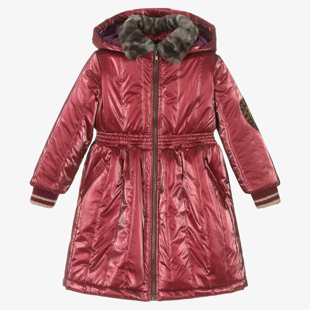 Chic burgundy red coat for girls by Pan Con Chocolate. This A-line style has an elasticated waist and a felted leopard print patch with a glittery gold 'P' on one sleeve. Smooth and shiny, this lightly padded cost has a faux fur animal print collar and a removable hood. Fastening with a zip, there are two front pockets and knitted cuffs to help keep in warmth.