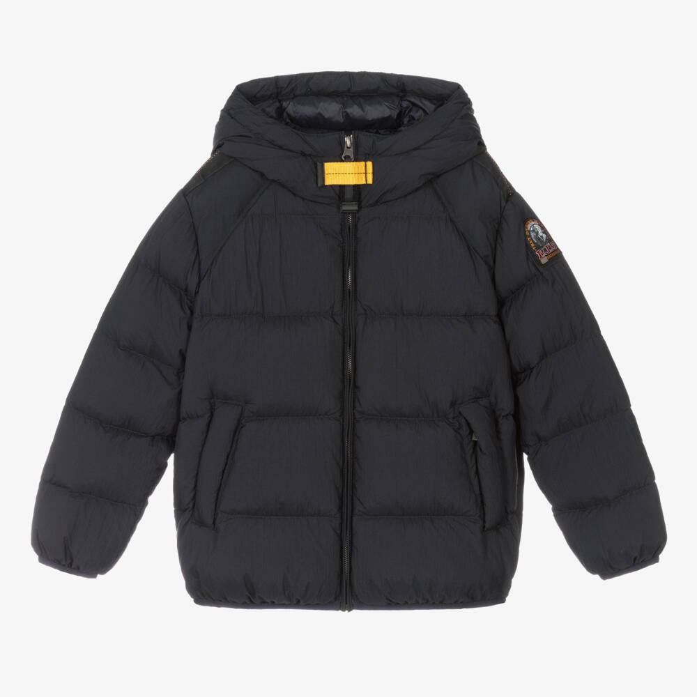 Mini-me dark navy blue jacket for boys by Italian outerwear brand Parajumpers, made in soft crinkled fabric with a water repellent treatment. This windproof layer is designed to keep them cosy in colder weather with a spacious hood and a lightweight, breathable down filling. It has two zip pockets on the front and an inner mesh velcro pocket to keep essentials safe. Zipping up at the front, it features the brand's signature yellow velcro tape below the chin and a distinctive logo patch on the arm.