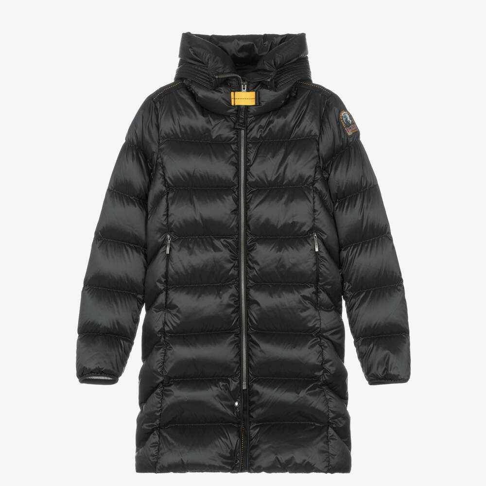 As seen in the adult collection, this dark navy blue coat for teen girls is from luxury brand Parajumpers. This innovative coat features instantly recognisable designer details, from the yellow velcro tape to the signature logo badge. Ideal for high-performance outerwear, it is water-resistant, windproof and down-filled. The hood has a popper fastening flap that extends for added protection against the elements, and breathable ventilation holes under the sleeves. It has zip-up pockets and an internal mesh pocket. This item is made with 20% recycled fabrics.
