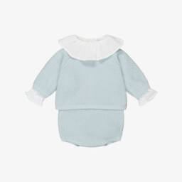 A traditionally styled blue and white shorts set for baby boys by Pasito a Pasito. Finely knitted in soft cotton, the cosy cardigan fastens neatly with pearlescent buttons, while the shorts have a gently ribbed waistband for easy dressing. The outfit comes complete with a white long-sleeved bodysuit. Made in soft cheesecloth, it has a sweet ruffle collar and button fastenings.