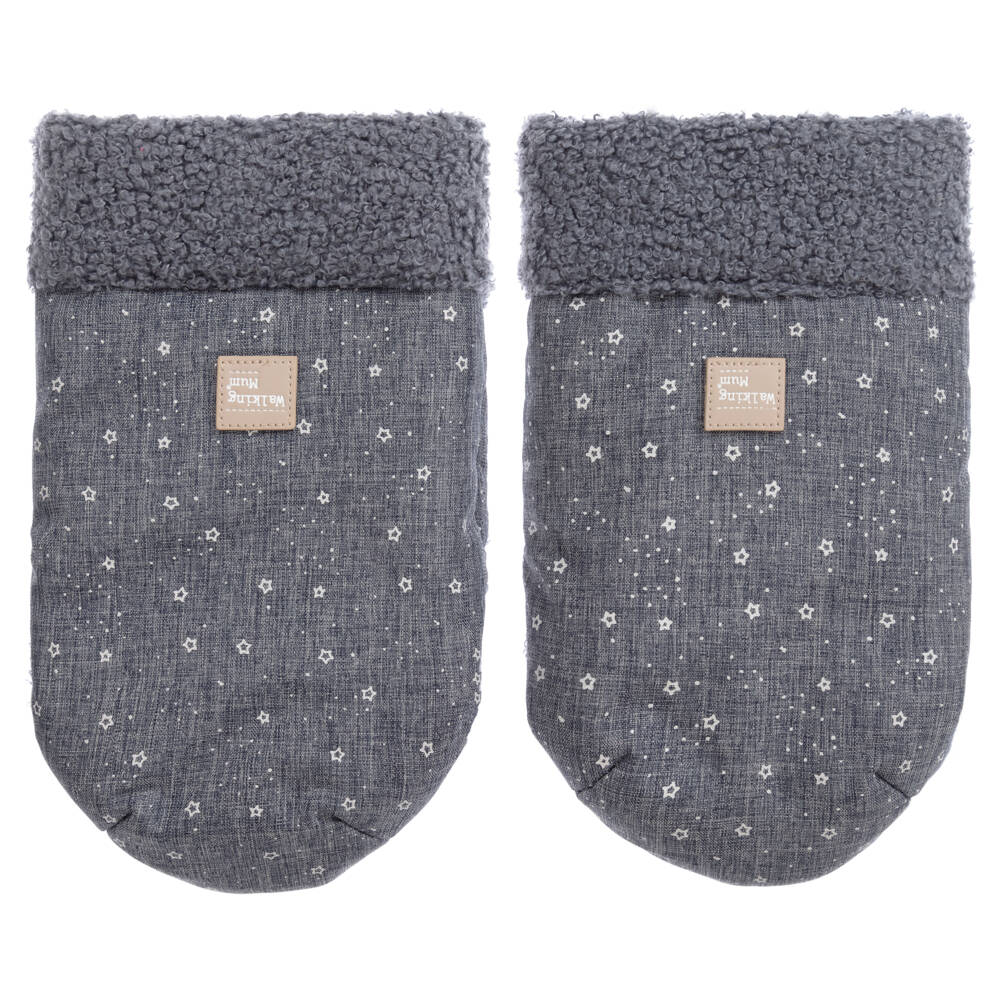 Blue stroller mittens with a white star print, by Pasito a Pasito Walking Mum. Made in waterproof nylon with a soft bouclé lining, they are ideal for keeping adults' hands warm and dry, and attach to most brands of strollers and prams.