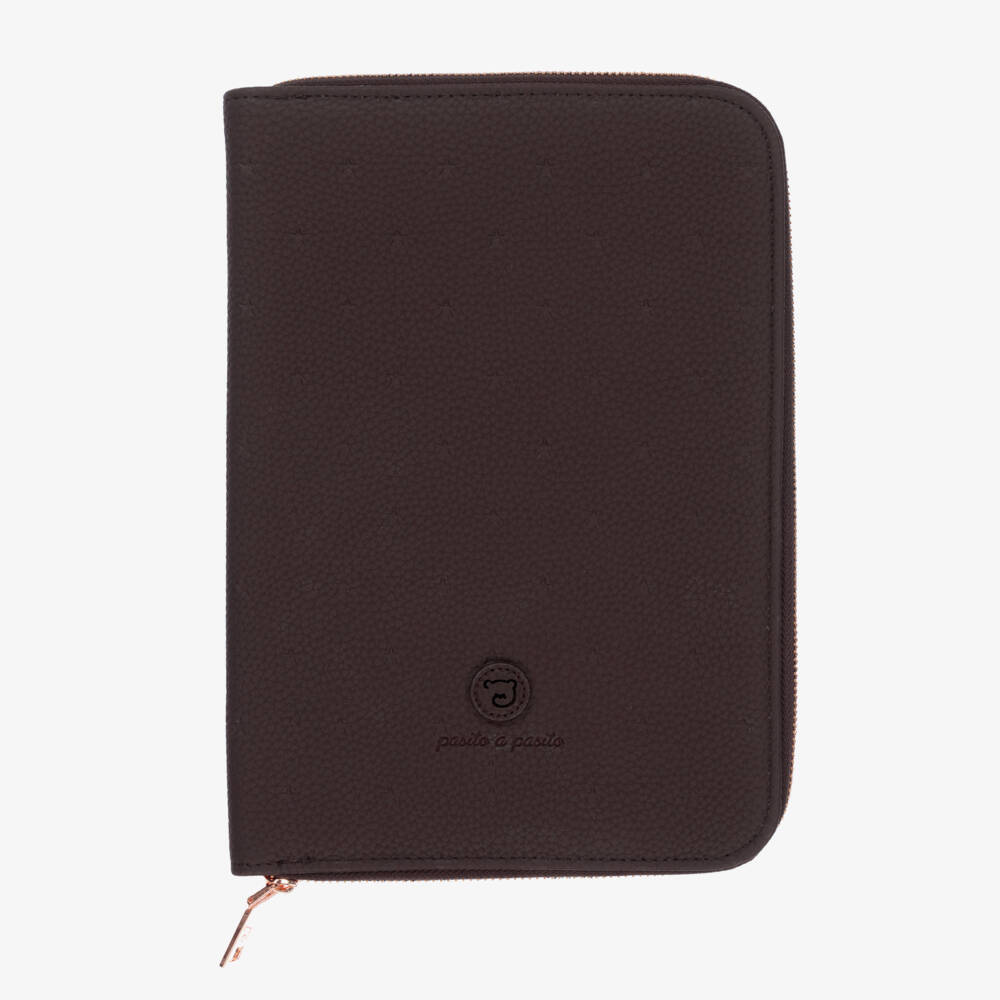 Brown document holder by Pasito a Pasito, made in grained faux leather with embossed stars. Whether on the go or at home, this stylish storage solution is ideal for keeping your little one's documents and medical records safe in one place. Fastenings with a rose gold zip, it can be opened flat for ease of use. It has multiple internal pockets and a smooth beige polyester satin lining with a monogram print.