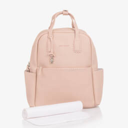 This stylish and practical cream changing backpack by Pasito a Pasito is ideal for carrying all of baby's essentials. Made in grained faux leather, it has an easy-to-clean lining and a large internal compartment with useful elasticated pockets. There is a zipped compartment on the front, with pouch pockets on the sides, ideal for bottles. The adjustable shoulder straps have attached clips, allowing the bag to be secured to a pram or stroller. It comes with a useful changing mat and a cute silver metal teddy charm.