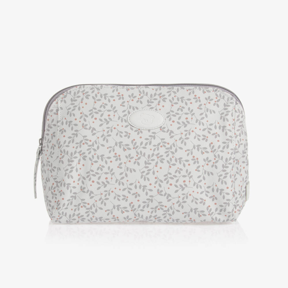 Pale grey faux leather wash bag for boys and girls by Pasito a Pasito, with a delicate brown and grey botanical berry print. Ideal as a pouch to hold travel essentials, it has a smooth lining with elasticated straps to keep items secure and a top zip fastening. A grey teddy bear appliqué and logo patch are stitched onto this useful wash bag.