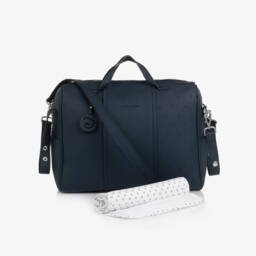 Stylish and practical navy blue changing bag by Pasito a Pasito, made in durable, grained faux leather with a subtle embossed star pattern and logo. Waterproof and fully washable, it has a branded satin lining, useful internal pockets for organising belongings, and a secure zip fastening. There are short carry handles, as well as a detachable shoulder strap and popper-fastening stroller straps for versatile use. This smart bag has a cute logo tag and comes with a changing mat, which is wipe clean on one side and has a soft absorbent towelling reverse.
