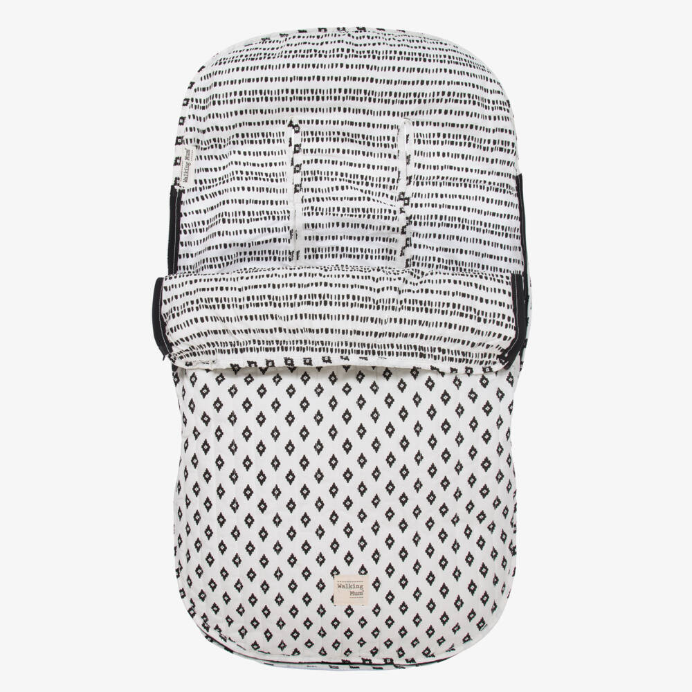 A softly padded black and white baby footmuff by Pasito a Pasito Walking Mum, for use in the stroller or car seat. The canvas front unzips on both sides for easy access and folds back to reveal the soft cotton lining patterned with small dashes. The back hooks over the stroller and has adjustable velcro openings and elastic velcro straps.