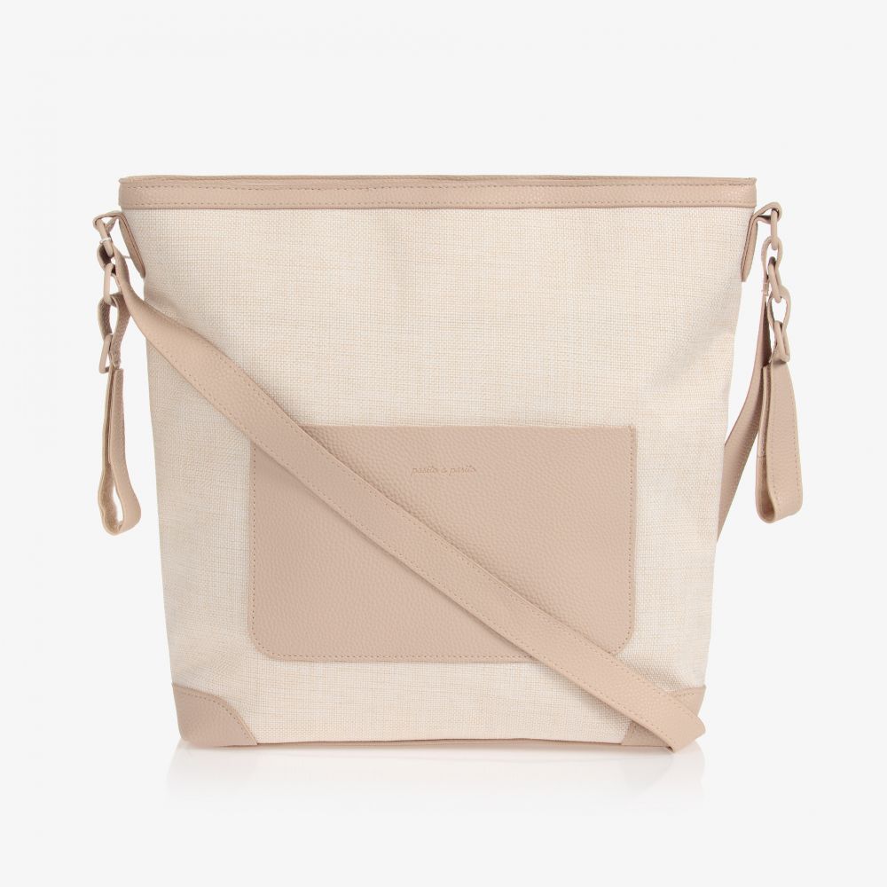 Taupe beige and ivory baby changing bag by Pasito a Pasito. This soft woven bag has a large smooth interior with pouch compartments and a zipped pocket. There are stroller straps, beige faux leather trims and a logo-embossed pocket on one side. It fastens with a zip on the top.