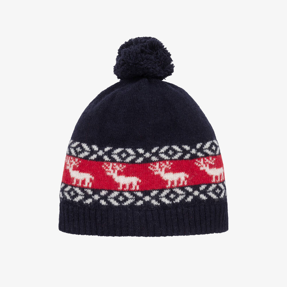 In navy blue and red, this cosy reindeer patterned hat for baby boys is by Patachou. Beautifully soft and lightweight, it is made in a luxurious blend of Merino wool and cashmere. It has a gently ribbed brim and a fluffy pom-pom on top.