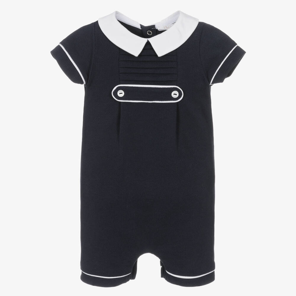 A traditional navy blue cotton shortie for baby boys by Portuguese brand Patachou, made in a soft and lightweight piqué. Nautically inspired, it has a smart white collar and trims, with a decorative buttoned panel and pleat detailing on the front. Popper fastenings on the back and between the legs give a neat finish.