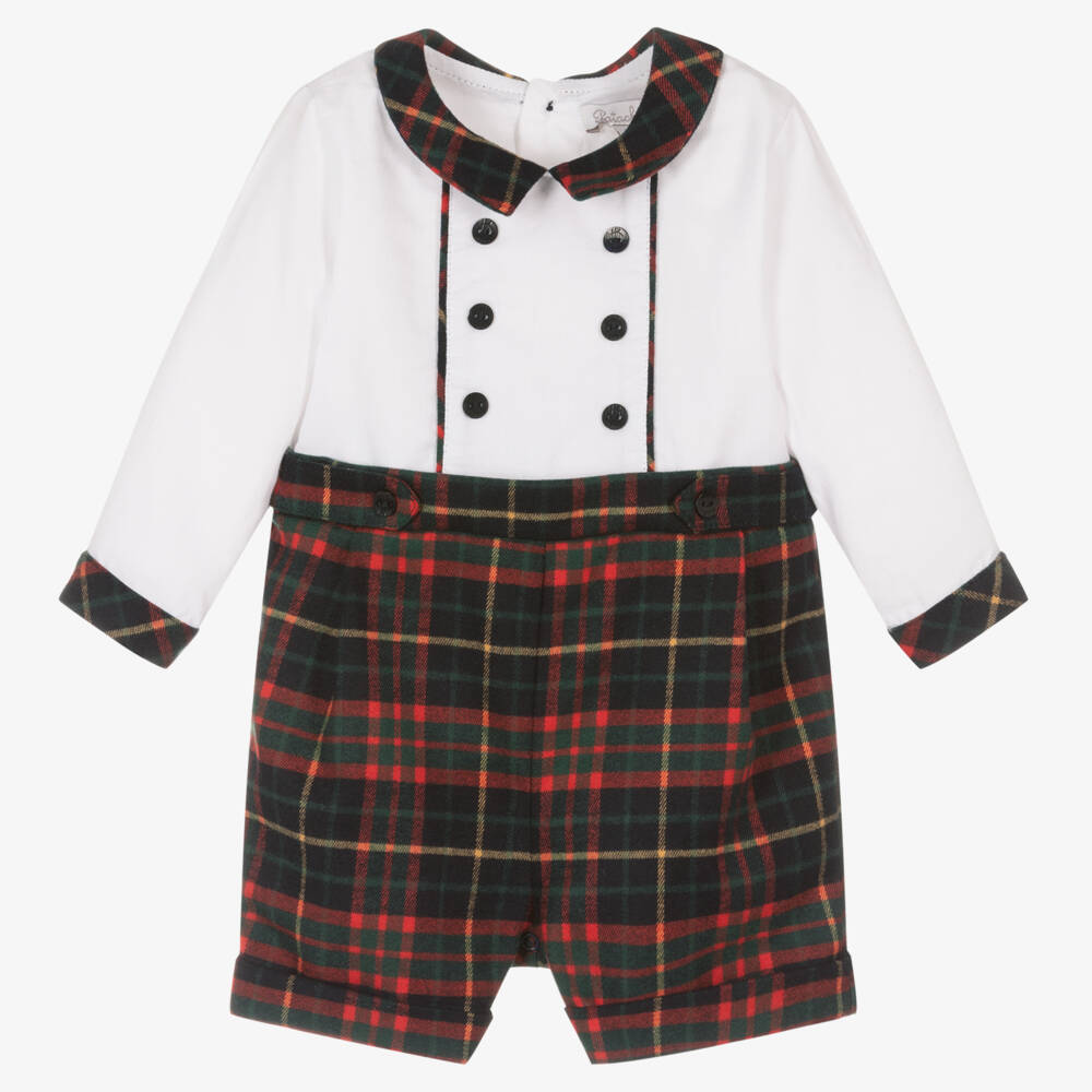 Smart red and green tartan shortie for baby boys by classic Portuguese brand Patachou. With the look of a two piece set, it has a white 'shirt' in soft cotton twill and a softly brushed tartan collar. On the front there are decorative logo buttons and tartan piping, matching the buttoned cuffs. The soft, brushed 'shorts' have pleats on the front, fixed turn-ups and useful popper fastenings between the legs. The shortie fastens with logo buttons around the back.
