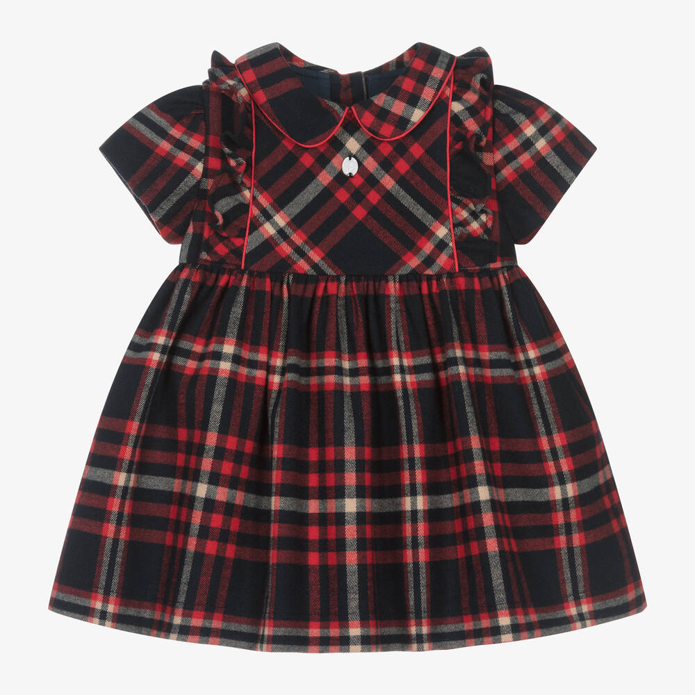 Charming navy blue and red short-sleeved dress for baby girls by Patachou, with a lovely tartan pattern. It is made in soft, brushed twill, with red piping on the sweet Peter Pan collar and frilled trims on the bodice. A pearlescent logo tab is stitched on the chest for a subtle branded touch. Lined in lightweight cotton, it fastens with neat buttons on the back.