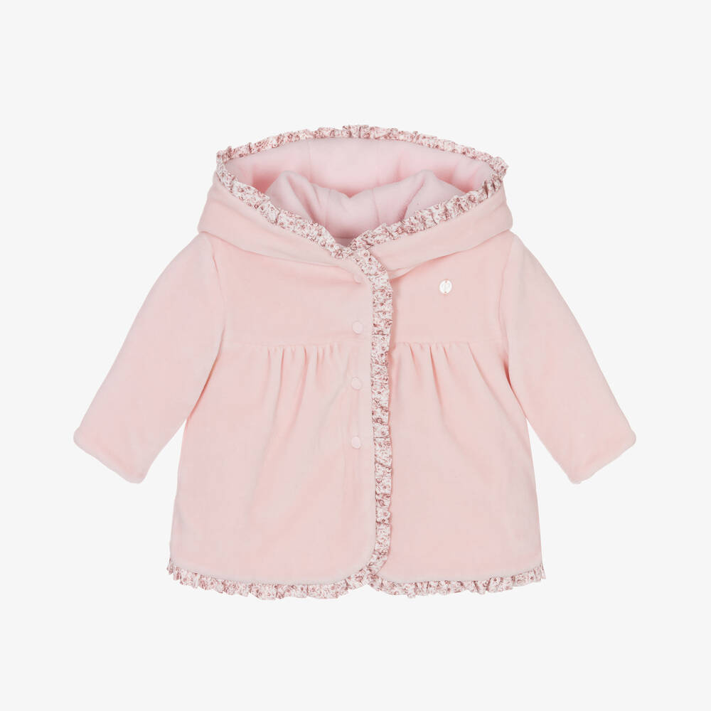 Light pink pram coat for baby girls by Portuguese brand Patachou, made in soft cotton blended velour. Warm and cosy, this hooded design has pretty floral trims and easy popper fastenings on the front. Lightly padded, it has a fleecy lining for warmth and a pearlescent logo charm is stitched on the chest for a subtle designer detail.