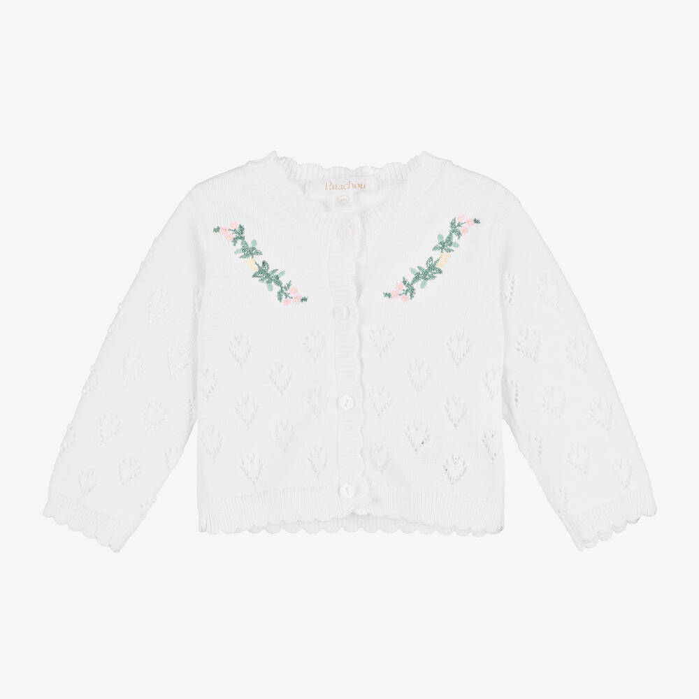 Beautifully timeless white cardigan for baby girls by Patachou. Finely knitted in soft cotton, it has a cute heart pointelle pattern, delightful floral embroidery in subtle shades and scalloped edges. It fastens neatly with buttons on the front.